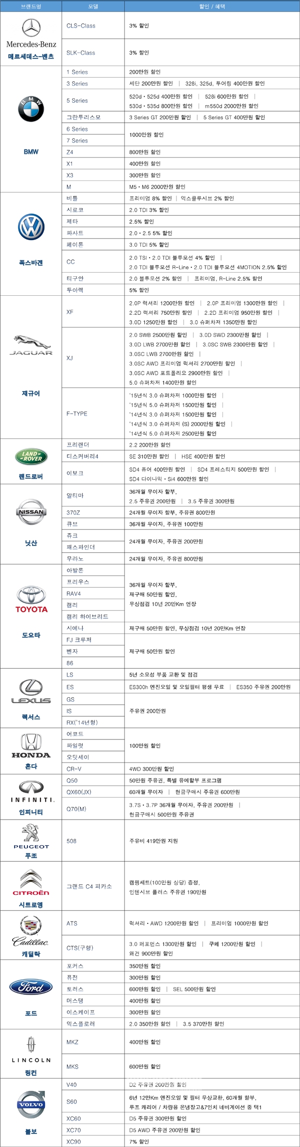 ▲메르세데스-벤츠 ▲BMW ▲폭스바겐 ▲재규어 ▲랜드로버 ▲혼다 ▲캐딜락 ▲포드 ▲링컨 등 9개 수입차 브랜드는 공격적인 가격할인을 하고 있다. 재규어 ‘XJ 3.0SC AWD 포트폴리오’ 모델의 경우는 2900만원을 할인 판매하여 가장 눈에 띄었다.