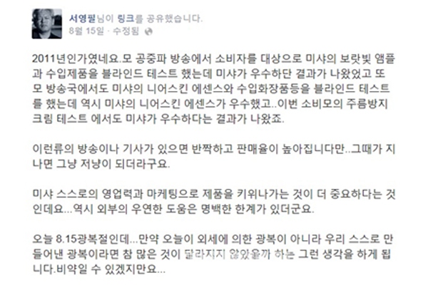 [컨슈머와이드-전휴성 기자] 미샤를 운영하고 있는 에이블씨엔씨의 서영필 대표이사가 수입화장품으로부터의 독립을 주창했다.서영필 대표는 지난 15일 자신의 페이스북에 광복절에 빗대어 미샤에 대한 의견을 남겼다.