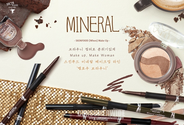 스킨푸드가 새롭게 선보인 ‘미네랄 메이크업 라인’은 총 6종으로 아이라이너, 아이섀도우, 마스카라, 아이브로우, 립스틱, 네일 등으로 구성됐다. 가을에 어울리는 깊고 달콤한 브라운 컬러를 중심으로 부드럽고 자연스럽게 물든 듯한 ‘멜로우 브라우니 룩’을 완성시킬 수 있는 것이 특징이다.