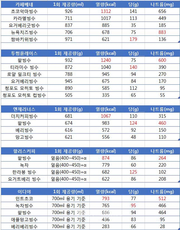 본지는 국내 커피전문점 ▲카페베네, ▲투썸플레이스, ▲엔제리너스, ▲할리스커피, ▲이디야 빙수의 칼로리, 당, 나트륨을 비교분석해 봤다.