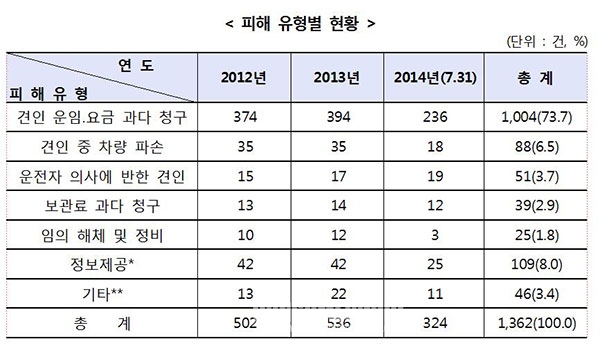 피해 1,362건을 유형별로 분석한 결과, ‘견인 운임·요금 과다 청구’로 인한 피해가 1,004건(73.7%)으로 제일 많았다. 이는 국토교통부에 신고된 운임․요금을 운송사업자들이 지키지 않고 있기 때문이다.