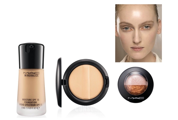 우선 가벼워 보이면서도 반짝임과 매트함의 대비를 통해 얼굴의 윤곽을 자연스럽게 살려준다. 최소한의 스킨 메이크업에 약간의 컬러를 더해 더욱 아름답게 살린 피부 표현이 포인트다. 광택감을 살려 주기 위해 미네랄 성분이 함유된 리퀴드 파운데이션을 얼굴 전체에 가볍게 발라주고, 코 양 옆 부분부터 눈 중앙 부분은 파우더를 쓸어 매트하게 표현한다. 눈 앞머리 부분에 미세한 펄감이 도는 미네랄라이즈 아이섀도를 터치해 주면 얼굴 전체의 윤기와 조화를 이루어 보다 이목구비를 뚜렷하게 한다.