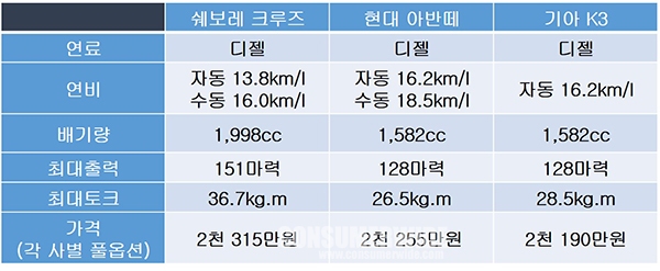 [컨슈머와이드-차기역 기자] 준중형 디젤 세단 쉐보레 ‘크루즈’, 현대 ‘아반떼’, 기아 ‘K3’의 연비를 비교해보면 ‘아반떼’가 제일 경제적인 것으로 나타났다.