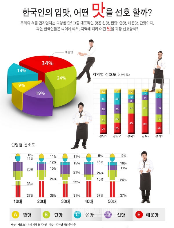 연령별로는 10대는 약 33%가 단맛을 가장 선호하였고 20대는 약 38%가 매운맛을 최고의 맛으로 꼽았다. 30대는 매운 맛이 31%로 가장 높았으나 전체적으로 고른 분포를 모였으며 40대는 매운 맛 37%와 신맛 24%로 특정한 맛에 호응이 높았다. 50대도 매운 맛이 37%로 가장 높았으나, 쓴맛을 선호한 비율이 18%로 타 연령대에 비해 선호도가 높았다.