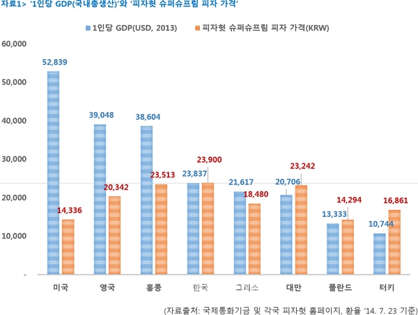 이를 보면 한국의 물가는 8개국 중 물가가 5번째로 높음을 알 수 있다. 경제수준과 물가, 화폐가치 등의 조건이 가장 비슷한 그리스와 비교해 보아도 한국의 슈퍼슈프림 피자가격은 5천420원이나 비싸다.